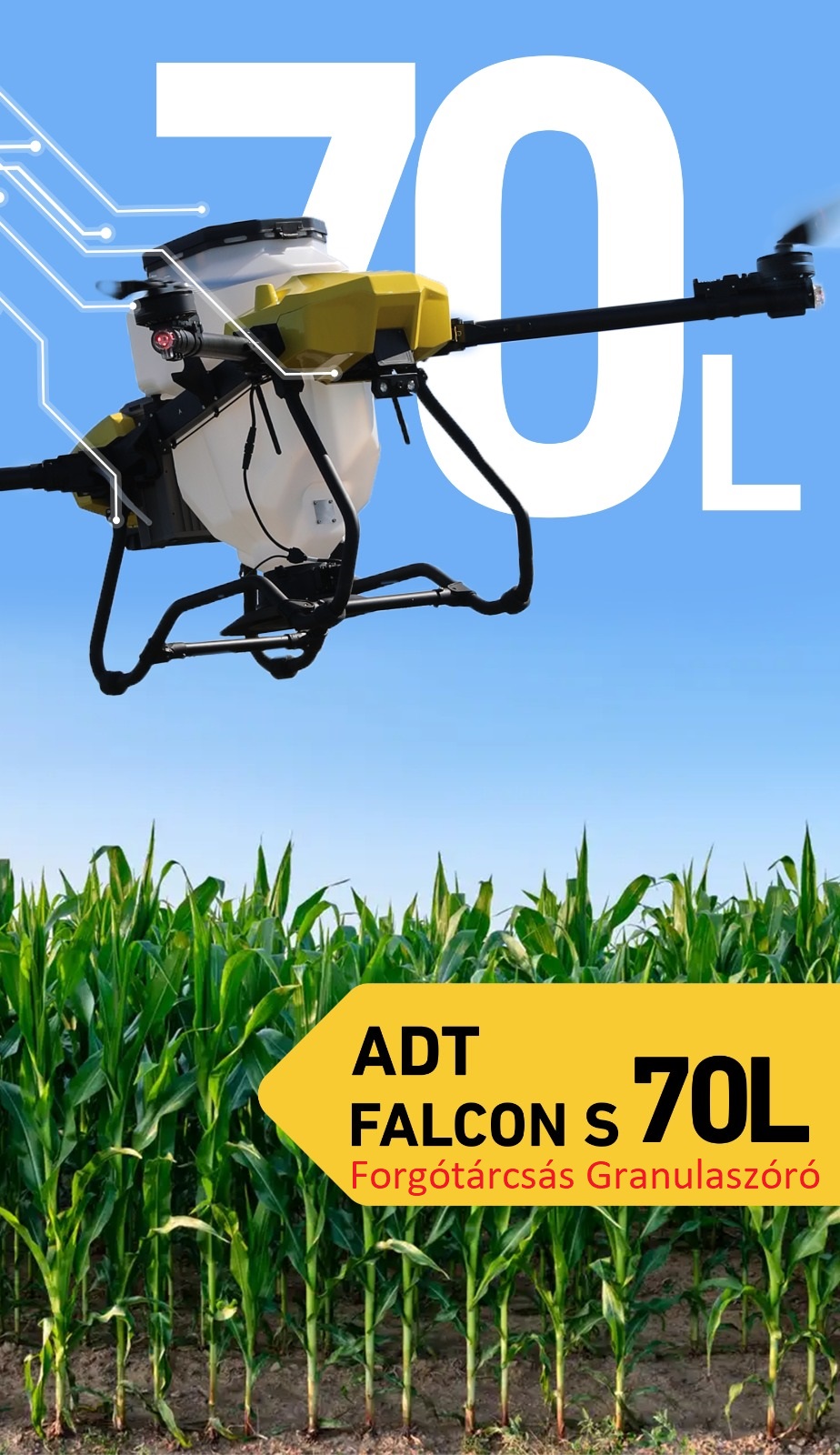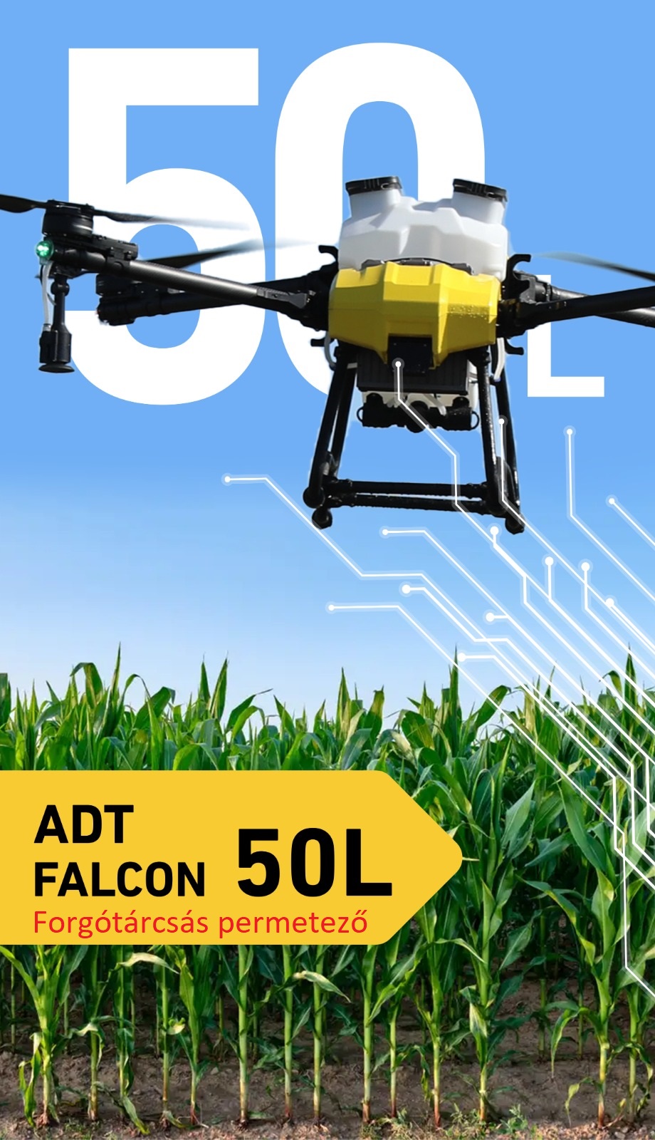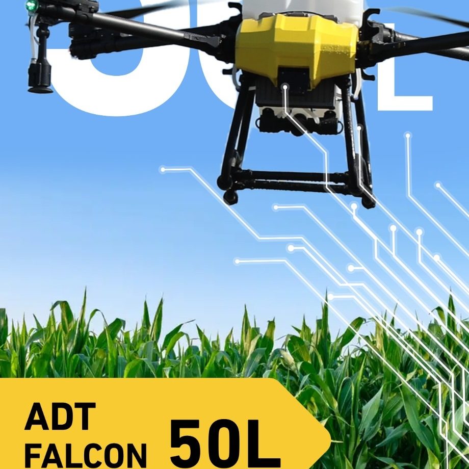 Az ADT Falcon 50L, 2 centrifugális szórófejjel és egy 50 literes tartállyal rendelkező mezőgazdasági (permetező) drón, amely kiválóan alkalmas a növény-, gyümölcs- és szőlőtermesztés területén történő gazdálkodás hatékonyabbá tételére. Egyaránt alkalmas permetezésre és szilárd anyagok szórására. Ez a drón számos előnnyel járhat a hagyományos növényvédelemhez képest.